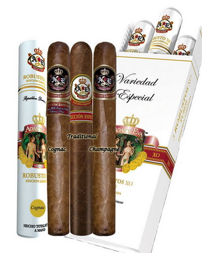 Cygara Adan y Eva 5 "x 50 Robustos pakowane będą po trzy sztuki, w czterech samplerowych wersjach. Pierwszy sampler to cygara z aromatem szampana, drugi z aromatem koniaku, trzeci w całości naturalny, a czwarty składający się z trzech różnych cygar(po jednym z każdego rodzaju). Każde cygaro będzie dodatkowo umieszczane w aluminiowej tubie, z odpowiednim dla danego rodzaju oznaczeniem.