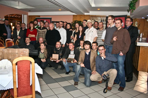 Jako że kolacja otwierająca spotkanie była zaplanowana na 17:30 to mieliśmy sporo czasu by ulokować się w pokojach, a potem zacząć się integrować z zacnym gronem. Posiedzieliśmy więc w barze gawędząc, paląc cygara i popijając szlachetny złoty trunek. W międzyczasie pojawiało się coraz więcej naszych napływających falami z różnych zakątków Polski. Przed godziną 0 przenieśliśmy się do dużej sali w której odbyła się właściwa część imprezy. Na pięknie udekorowanych stołach czekało już na nas małe co nie co. Skonsumowaliśmy więc dosyć oryginalną i co najważniejsze smaczną przystawkę, co by się nieco nasycić. Z głównym daniem poczekaliśmy jednak na naszego głównego sponsora czyli Krzysztofa Najsztuba ze sklepu AKAN. Gdy ten się zjawił potrawy wjechały na stoły. Nie będę się tu rozpisywał co jedliśmy, bo całe menu jest w temacie foscowym. Powiem tylko, że dobre to było. No na prawdę dobre.